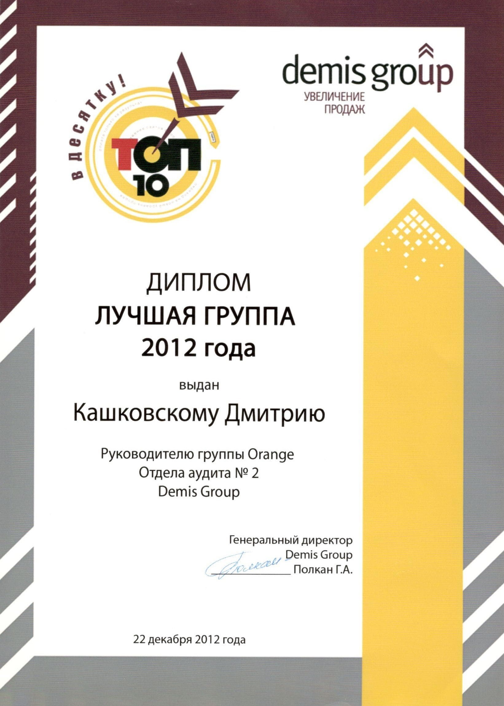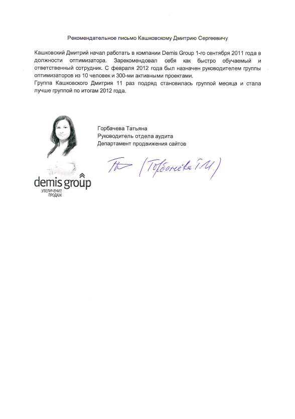 "Кашковский Дмитрий начал работать в компании Demis Group 1-го сентября 2011 года в должности оптимизатора. Зарекомендовал себя как быстро обучаемый и ответственный сотрудник. С февраля 2012 года был назначен руководителем группы оптимизаторов из 10 человек и 300-ми активными проектами. Группа Кашковского Дмитрия 11 раз подряд становилась группой месяца и стала лучшей группой по итогам 2012 года."