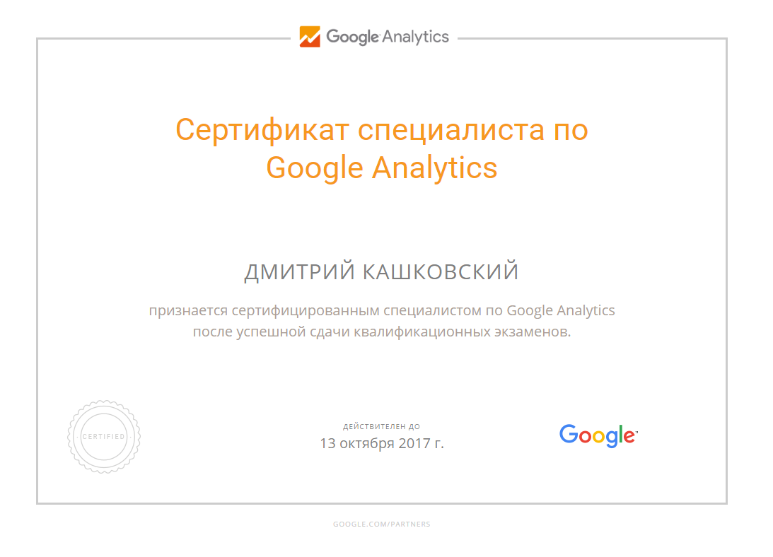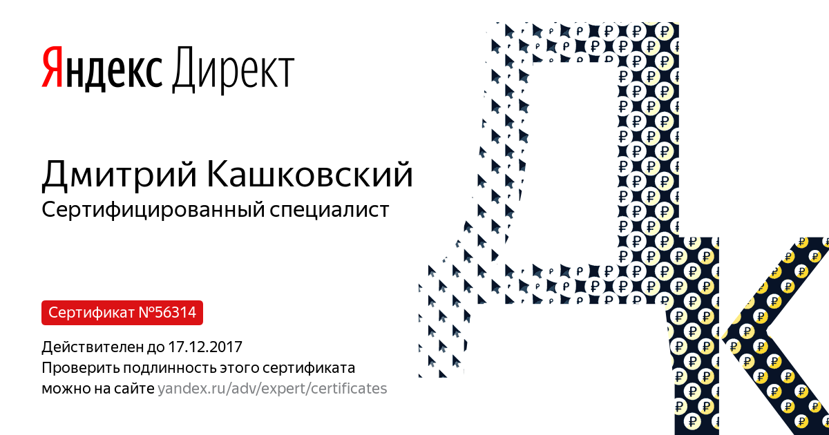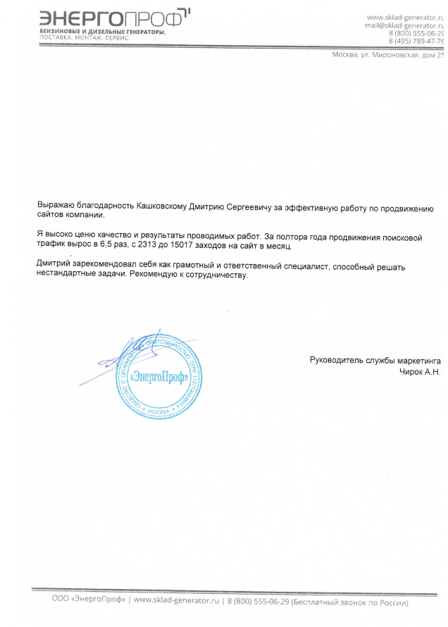 "Выражаю благодарность Кашковскому Дмитрию Сергеевичу за эффективную работу по продвижению сайтов компании. Я высоко ценю качество и результаты проводимых работ. За полтора года продвижения поисковой трафик вырос в 6,5 раз, с 2313 до 15017 заходов на сайт в месяц. Дмитрий зарекомендовал себя как грамотный и ответственный специалист, способный решать нестандартные задачи. Рекомендую к сотрудничеству."